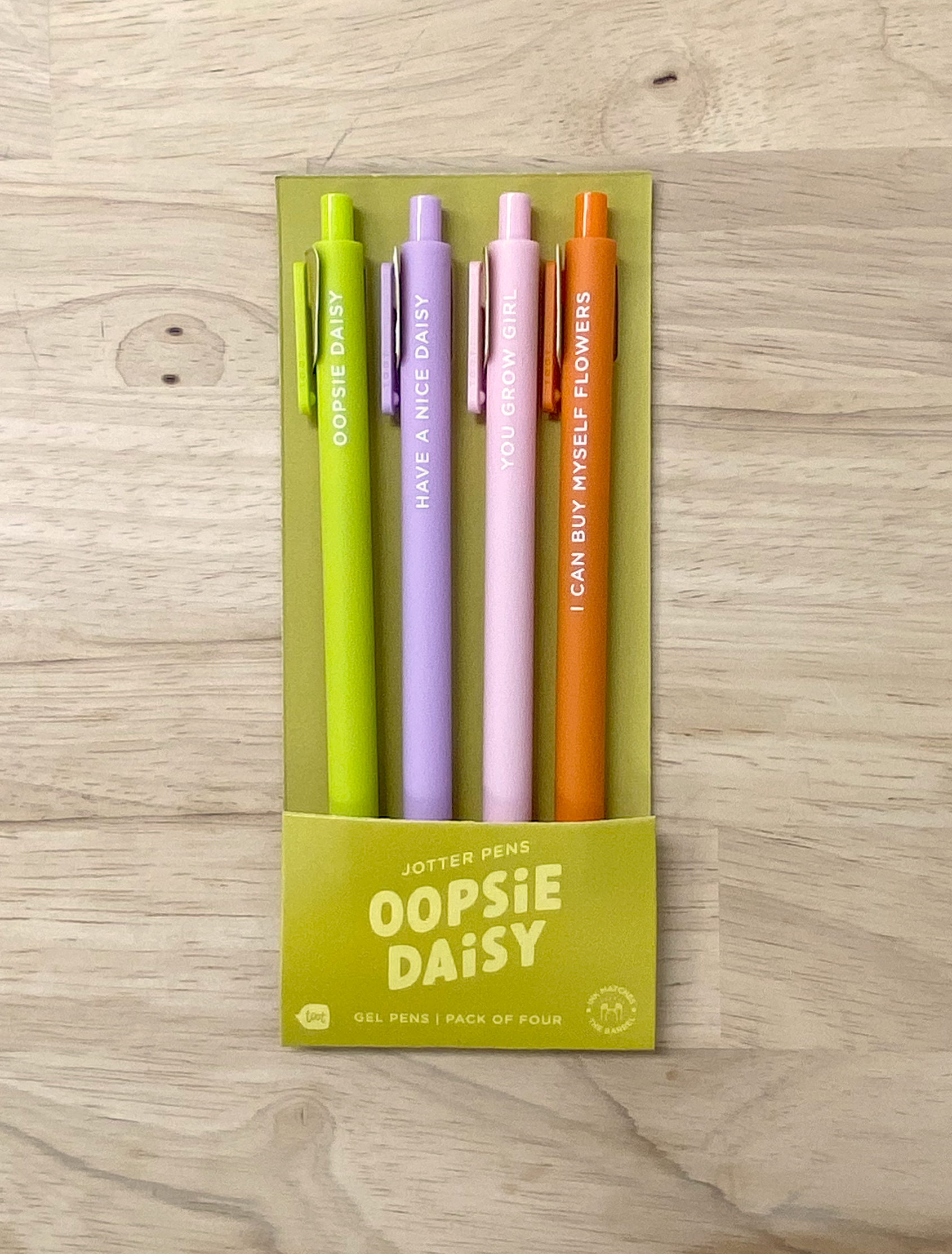 Spruce up your writing game with our OOpsie Daisy Pen Set! These gel pens feature playful sayings on each barrel, adding a touch of fun to every stroke. Perfect for journaling, note-taking, or just adding a little quirk to your everyday writing. (Wink wink!)